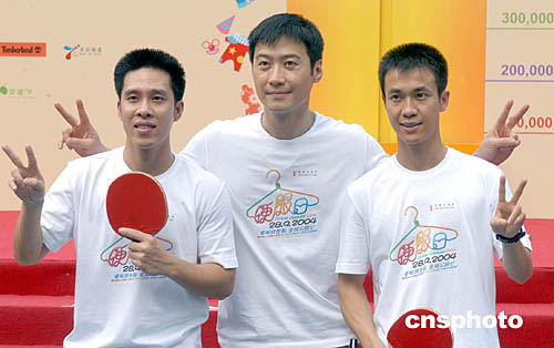 歌星黎明(中)與奧運乒乓球男子雙打銀牌得主高禮澤(左)、李靜9月28日在香港出席「公益金便服日」突破紀(jì)錄儀式,大會并舉行乒乓球友賽,賽后黎明與香港「乒乓孖寶」合照。