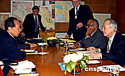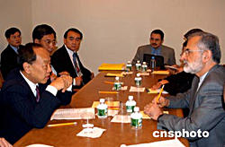 當?shù)貢r間九月二十八日,正在紐約聯(lián)合國總部出席第五十九屆聯(lián)大的中國外長李肇星(左),會見了聯(lián)合國名人小組成員。由聯(lián)合國秘書長安南提議建立的“威脅、挑戰(zhàn)與變革”高級別名人小組,專門負責研究聯(lián)合國的改革問題,并將于年底提出報告,供會員國審議。作者:趙海燕