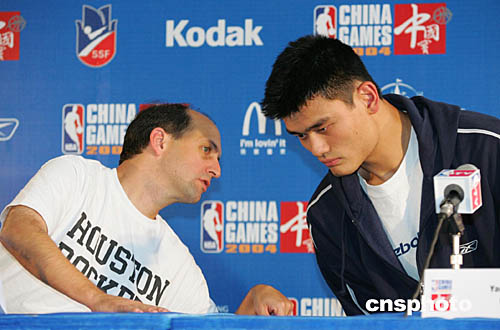 坐在一邊的姚明此時(shí)興致勃勃地接了下茬:“這一點(diǎn)上我覺得杰夫(范甘迪)可以和中國(guó)隊(duì)的主教練哈里斯交流一下”。范甘迪反問(wèn)姚明“他中文說(shuō)得好嗎”,姚明笑著耳語(yǔ)道“也不怎么樣”,話音通過(guò)麥克風(fēng)傳出,范甘迪得意地大笑,記者們也被這一老一少調(diào)侃逗樂(lè)了。