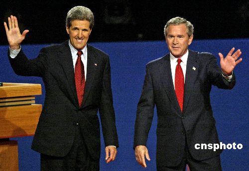 中新網(wǎng)10月14日電 美國總統(tǒng)候選人第三場辯論于美東時(shí)間13日晚9點(diǎn)在亞利桑那州立大學(xué)展開。由于是投票日前的最后一場辯論,布什與克里都將全力抓住這次給全國選民留下深刻印象、宣講施政方針、全面攻擊對方的最重要機(jī)會。
