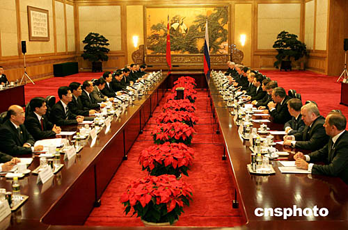 普京完全贊同胡錦濤的看法和建議,他說,發(fā)展俄中合作是俄一貫政策。《俄中睦鄰友好合作條約》為兩國關(guān)系發(fā)展奠定了重要基礎(chǔ),雙方解決邊境問題、就俄加入世貿(mào)組織達成協(xié)議是兩國戰(zhàn)略協(xié)作伙伴關(guān)系的體現(xiàn)。我們愿與中方切實落實該條約的實施綱要,推動雙方在各領(lǐng)域的合作。俄方希望加強經(jīng)貿(mào)合作,爭取在數(shù)量和質(zhì)量上均不斷提高。他重申,俄方關(guān)于同中國的能源合作的決定始終未變,也愿同中國加強在科技、人文等領(lǐng)域的合作。