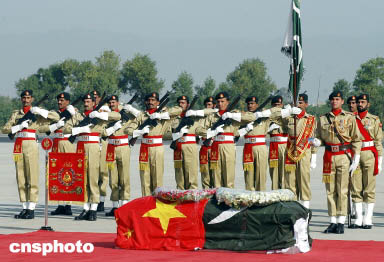 巴基斯坦禮兵抬著王鵬的靈柩走向?qū)C(jī)