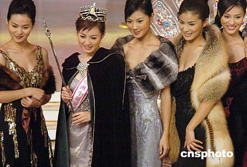 2004亞洲小姐競選總決賽,于十月二十四日晚在香港演藝學院舉行,來自杭州的佳麗呂晶晶奪得桂冠后,眾佳麗與呂晶晶拍照留念。中新社記者:錢興強