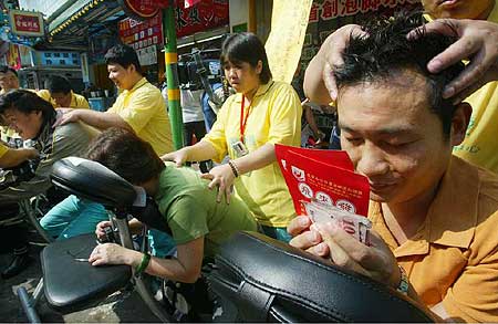 許多投注站都貼出“第100位樂透億萬富翁”、“頭獎(jiǎng)獎(jiǎng)金上看6.5億元”的促銷海報(bào),還有投注站推出“買彩券送免費(fèi)按摩”的促銷活動(dòng)。