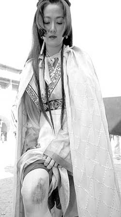 休息了一個(gè)小時(shí)后,王思懿又重新上馬繼續(xù)拍攝了,只是上下馬、走路時(shí)需要人攙扶著。而剛才還不省人事的王思懿跟沒事似的對(duì)記者做了個(gè)鬼臉,“騎馬要坐著,沒事的。”而手上全都是剛才磕碰留下的傷痕。思懿大拇指骨節(jié)處一塊凸起引起了記者的注意,思懿指著手說,這是前不久拍舞刀戲時(shí),用力過猛,大拇指骨折留下的痕跡,現(xiàn)在還沒恢復(fù)。而話音未落,王思懿更撩起褲腿,膝部被一塊碗口大小的深紫血印整個(gè)覆蓋,真是慘不忍睹,“這是在拍攝一場(chǎng)打戲時(shí)腿部躲閃慢了一步,刀劈到腿上的結(jié)果!彼架舱f,當(dāng)時(shí)疼得要命,整個(gè)膝蓋腫得老高,比這次還嚇人。不僅如此,因?yàn)橐╂z甲,思懿的腰上和肩上也磨出了一道道血印。不過,當(dāng)被問到苦不苦時(shí),思懿卻表示早已習(xí)慣了,“這點(diǎn)小傷不算什么,拍武戲哪有不受傷的,每次拍攝時(shí)都不覺得疼,只是回去洗澡時(shí)才發(fā)覺:‘唉?怎么這么疼,全都破了!