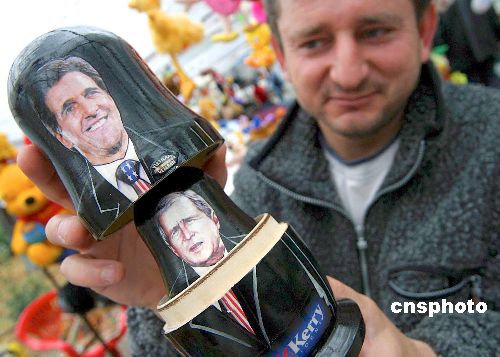 11月2日,美國總統(tǒng)大選開始正式投票。同日,遠在歐洲的保加利亞,印有候選人布什和克里形象的“套娃”木偶玩具上市,銷售火爆。Ic/cnsphoto 攝