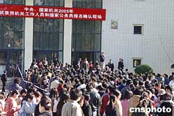 11月5日,已在網(wǎng)上報(bào)名參加2005年國(guó)家公務(wù)員考試的考生在北京農(nóng)業(yè)展覽館3號(hào)館進(jìn)行報(bào)名確認(rèn),現(xiàn)場(chǎng)人山人海,但井然有序。作者:張蕾