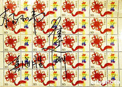 由中國(guó)航天第一人楊利偉及飛天預(yù)選航天員聶海勝、瞿志剛親筆簽名,并隨“神州五號(hào)”一起遨游太空的《神五搭載紀(jì)念郵票》,十一月九日亮相申城。圖為該郵票三個(gè)整版之一的同心結(jié)版。作者:湯彥俊