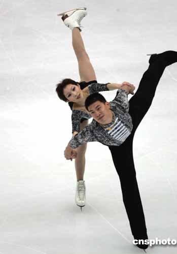 中國(guó)隊(duì)派出雙人滑第一組合、兩度世錦賽冠軍申雪/趙宏博出戰(zhàn),他們攜新編動(dòng)作在加拿大站大獎(jiǎng)賽上首演成功奪取冠軍。由于頭號(hào)種子俄羅斯選手托特米安妮娜/馬列寧的缺席,中國(guó)組合是參加本站比賽世界排名最高的運(yùn)動(dòng)員。今天的短節(jié)目比賽,申雪/趙宏博在九對(duì)選手中第六個(gè)出場(chǎng),盡管在做拋跳三周時(shí),申雪落地單手扶冰出現(xiàn)小失誤,但這并沒有影響他們之后的發(fā)揮,在《月光》悠揚(yáng)的樂曲聲中順利完成了八個(gè)規(guī)定動(dòng)作,以六十六點(diǎn)三八分位列第一。
