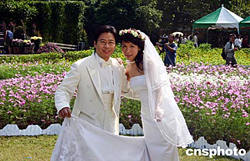 11月12日,臺(tái)北市士林官邸舉辦大型菊展,吸引了數(shù)以千計(jì)的民眾觀賞。圖為一對(duì)新人在菊花叢前拍攝婚紗照,場(chǎng)面溫馨浪漫。中新社記者:董會(huì)峰