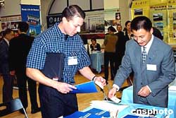 不少美國(guó)人今天一早就來(lái)到洽談會(huì)現(xiàn)場(chǎng)咨詢和索取資料,其中一些人從來(lái)沒(méi)有學(xué)過(guò)中文,但對(duì)中國(guó)文化充滿興趣。還有一些人則希望能到中國(guó)進(jìn)修,為自己未來(lái)的發(fā)展增加能量。參展的十所中國(guó)名校中有七所接收外國(guó)留學(xué)生超過(guò)一千人,他們今天圖文并茂地向來(lái)訪者介紹學(xué)校課程設(shè)置、教學(xué)設(shè)施、教學(xué)質(zhì)量等留學(xué)信息。