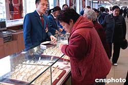 在國際金價上揚下,京城黃金第一家----北京菜市口百貨股份有限公司從十一月十六日起,將足金飾品售價由每克126元人民幣上調(diào)至130元。當日在北京菜百新世紀商場,一些顧客面對甫漲價的金飾品頗有“相見恨晚”之意。作者:鄒憲