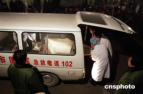 二零零四年十一月二十一日晚,經(jīng)過(guò)連續(xù)搜索搶救,河北省邢臺(tái)市沙河礦難死亡人數(shù)又有所增加,又有十多名礦工的遺體被抬出金鼎鐵礦巷口。中新社記者:武仲林