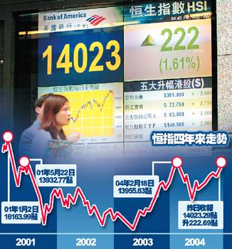 港股今早輕微高開九點(diǎn),恒指開市報(bào)一萬三千八百零九點(diǎn)。后市況反覆向上,升幅不斷擴(kuò)大,至中午收市時(shí)恒指已突破一萬四千點(diǎn)。下午,恒指一度高見一萬四千零四十八點(diǎn)。在地產(chǎn)和工商股帶領(lǐng)下,港股以接近全日最高位收市。恒指收?qǐng)?bào)一萬四千零二十三點(diǎn),升二百二十二點(diǎn),升幅百分之一點(diǎn)六,成交二百六十二點(diǎn)七億港元,比二十二日多了一半。