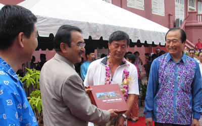 中國駐馬來西亞大使王春貴先生、鳳凰衛(wèi)視控股有限公司執(zhí)行副總裁、中文臺臺長王紀(jì)言先生、中國江蘇省太倉市常委及宣傳部長張志明先生,以及馬六甲州首席部長拿督斯里阿里士波先后在慶祝儀式上發(fā)言。之后,馬來西亞著名書畫家鐘正山先生向“鳳凰號”贈送其墨寶“一帆風(fēng)順”以表祝福。
