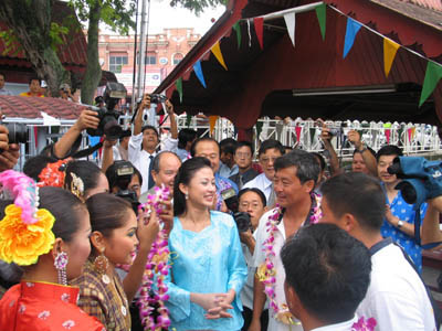 29日一早,在舞獅及具馬來特色的舞蹈的熱烈歡迎下,“鳳凰號”船員乘坐擺渡船緩緩航行到達(dá)紅屋碼頭。馬來西亞、印度裔及華裔少女身著特色服裝為這3位乘風(fēng)破浪的“鳳凰號”英雄們獻(xiàn)花致敬。隨后,搭乘花車到達(dá)慶祝儀式現(xiàn)場。在鳳凰衛(wèi)視主持人薩文和2004年度中華小姐大賽冠軍李詩琪的主持下歡迎儀式正式開始。