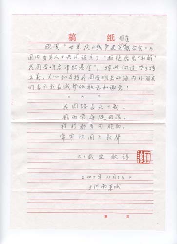 已90歲高齡的耿諄老英雄表示心領身不領,特寫感謝信對此表示支持。信上說:“欣聞‘世界抗日戰(zhàn)爭史實維護聯(lián)合會’與國內有關人士共同設立了拒絕鹿島‘和解’花岡受難者津貼基金,特此向這些主持正義、關心和支持花岡受難者的海內外朋友們表示我最誠摯的敬意和謝意!”并附詩一首:花岡路長六十載,風雨榮辱隨相跟。程程都有同胞助,常常欣聞正義聲。