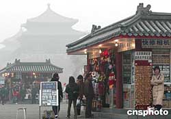 圖:北京持續(xù)大霧 故宮午門商販生意冷清