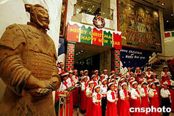 一名威武的“秦代兵馬俑”微笑著聆聽西安市兒童圣誕唱詩(shī)班的優(yōu)美歌聲。12月4日的周末夜晚,西安市喜來登大酒店舉行迎接圣誕節(jié)亮燈儀式。與此同時(shí),這座古老城市的圣誕氣氛越來越濃。中新社記者:任晨鳴