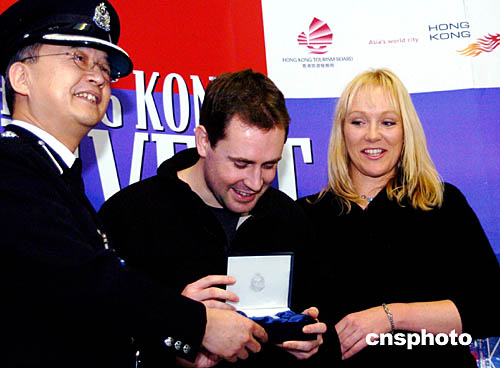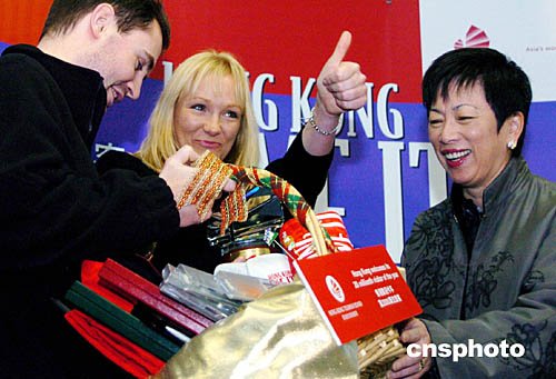 香港旅發(fā)局主席周梁淑怡與香港入境事務(wù)處機(jī)場(chǎng)管制科指揮官蔡普特,今天在機(jī)場(chǎng)舉行歡迎儀式,向芭芭拉頒發(fā)證書,贈(zèng)送香港旅游發(fā)展局水晶帆船等紀(jì)念品,共祝香港旅游邁進(jìn)新旅程。