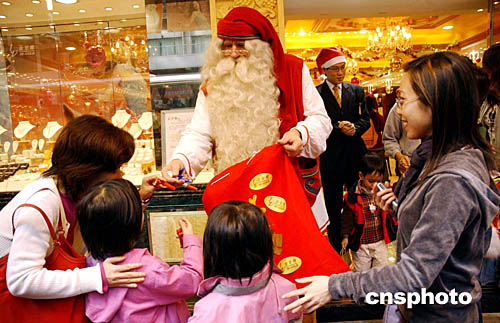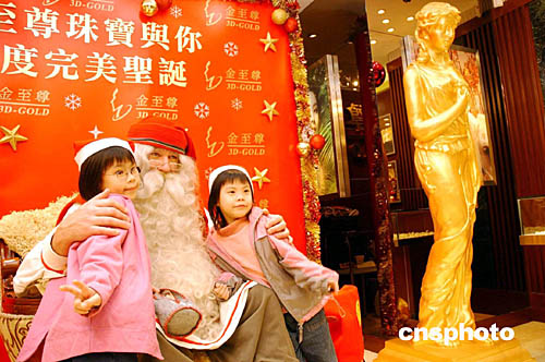 圖為圣誕老人在金至尊珠寶店向市民贈(zèng)送禮物。