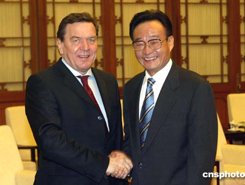 施羅德贊同吳邦國對(duì)德中關(guān)系的評(píng)價(jià)。他說,中德關(guān)系建立在相互信任的基礎(chǔ)上,各個(gè)方面的合作都很好。德國政府重視德中關(guān)系,將繼續(xù)堅(jiān)持一個(gè)中國政策。德方愿進(jìn)一步加強(qiáng)兩國議會(huì)業(yè)已存在的良好合作關(guān)系。同時(shí),愿繼續(xù)加強(qiáng)與中國的民間交往,以及文化交流。德方愿與中方一道使德中關(guān)系始終保持高水平的發(fā)展。
