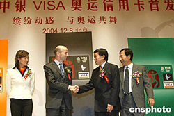 十二月八日,中國銀行聯(lián)手Visa國際組織,在北京發(fā)行全球首張以二零零八年奧運(yùn)會(huì)為主題的“中銀VISA奧運(yùn)信用卡”。中新社記者:廖文靜