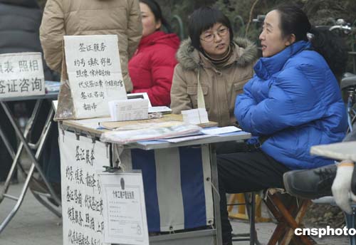 十二月八日,美國大使館簽證處門口的個體服務一條龍生意火爆,前來咨詢的北京市民絡繹不絕。
