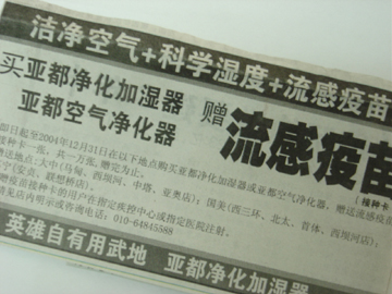 中新網(wǎng)12月14日電 今日,北京一些媒體刊出一則買亞都加濕器贈(zèng)流感疫苗的廣告,該廣告稱,從當(dāng)日起至12月31日,將在國(guó)美、大中、蘇寧的部分賣場(chǎng)買加濕器贈(zèng)送流感疫苗。有法律界人士認(rèn)為,按照《傳染病防治實(shí)施辦法》規(guī)定,流感疫苗這種用于防治傳染病的生物制品,應(yīng)屬各級(jí)疾控防疫體系統(tǒng)一管理,其他任何單位均無(wú)權(quán)銷售,更不能成為銷售加濕器的促銷品,所以亞都此舉已涉嫌違規(guī)。