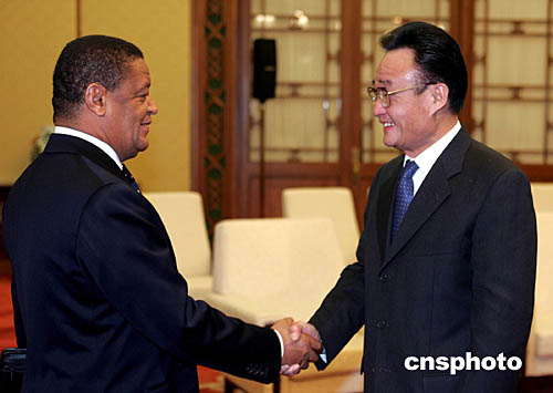 中新社北京十二月二十一日電(記者邢利宇)全國(guó)人大常委會(huì)委員長(zhǎng)吳邦國(guó)今日下午在人民大會(huì)堂會(huì)見了埃塞俄比亞議會(huì)聯(lián)邦院議長(zhǎng)穆拉圖一行。