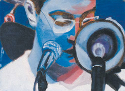 竇唯還特別喜歡用畫描繪自己樂隊(duì)演出時的景象,在昨日曝光的作品中就有兩幅。從畫面上看,一組搖滾樂隊(duì)正在舞臺上盡情揮灑激情,而臺下的觀眾也投入欣賞。另外一幅自畫像更是惹眼,藍(lán)色是畫的基調(diào),畫中的竇唯掩在兩只話筒后面,低頭正沉醉地低唱著?偟目磥,竇唯的小畫未必惹眼但很精妙。不賣不展