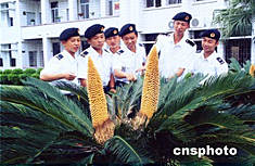 被廣東湛江評為“花園式單位”的軍港保障部隊(duì)營區(qū)內(nèi)五月初出現(xiàn)了一道新風(fēng)景:十余棵鐵樹紛紛吐出了金黃色的花蕊,其中有兩棵還開出了并蒂花。這一罕見奇葩,吸引了不少官兵前來觀賞。作者:梁利靈