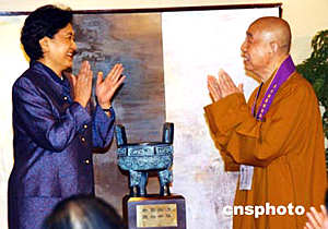 全國政協(xié)副主席、中共中央統(tǒng)戰(zhàn)部部長劉延東,5月26日在香港會見并宴請六大宗教領(lǐng)袖,圖為劉延東向覺光法師等宗教領(lǐng)袖贈送禮物──中華寶鼎。作者:洪少葵