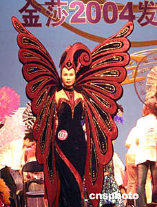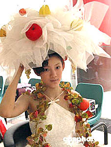 南京金莎二零零四發(fā)型化妝大賽上的水果妝金莎二零零四發(fā)型化妝大賽五月二十七日在南京紫金大戲院舉行,來自江蘇美容美發(fā)業(yè)的二百多名選手參加了剪吹、新娘化妝、形象設計等環(huán)節(jié)的比賽。作者:孫愛華
