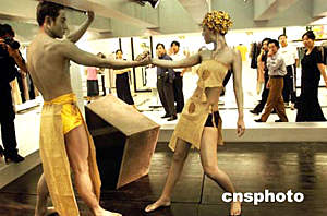 五月二十八日,地處“京西經濟帶”核心地區(qū)的“北京華宇時尚購物中心”開業(yè),兩位藝人現(xiàn)場進行人體藝術表演,為商廈造勢。中新社記者:鄒憲