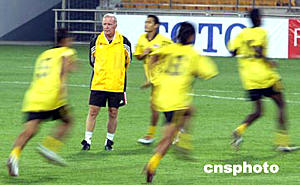 六月八日,馬來西亞足球隊(duì)在天津泰達(dá)足球場進(jìn)行適應(yīng)場地訓(xùn)練。二零零六年世界杯足球賽亞洲區(qū)預(yù)賽中國隊(duì)對馬來西亞隊(duì)的比賽將于六月九日晚在這里舉行。圖為馬來西亞主教練哈里斯正對隊(duì)員進(jìn)行現(xiàn)場指導(dǎo)。中新社記者:毛建軍