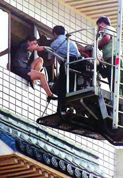 4時(shí)32分,“靠近!再靠近!”四層一個(gè)窗口,兩名消防員對(duì)著云梯喊著。云梯穩(wěn)穩(wěn)地靠在窗口,一名女子被抬出,“快抱被子來(lái)!給她蓋上!”大廈一名女領(lǐng)班聲音已沙啞!瓣P(guān)門!快走!”救護(hù)車呼嘯而去。