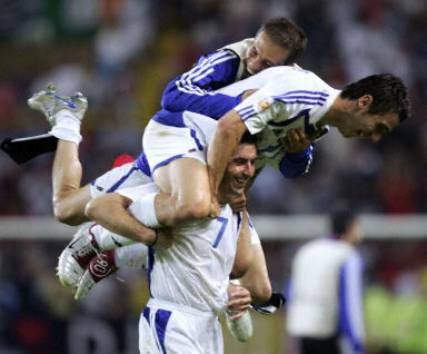 希臘隊則創(chuàng)造了首次進軍國際大賽四強的最好成績,成為本屆比賽最大的“黑馬”。他們先后擊敗葡萄牙、法國,戰(zhàn)平西班牙,闖入四強讓人心服口服。在半決賽中,他們將對陣捷克隊和丹麥隊比賽的勝者。
