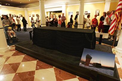 展覽展出了里根葬禮過程中所用過的物品和畫像,其中包括幾十張巨幅照片、放置有里根骨灰盒的棺材、以及6月5日在“里根”號(hào)航母上飄揚(yáng)的旗幟等。同時(shí),參觀者還有幸觀看葬禮的錄像。