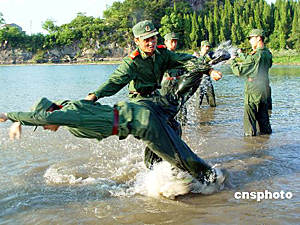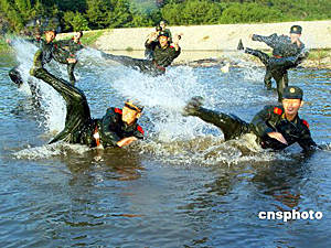 7月18日,浙江省仙居縣武警官兵頂著烈日,冒著酷暑進(jìn)行水上高難項目訓(xùn)練。為適應(yīng)水上戰(zhàn)斗能力,仙居縣武警官兵頂著烈日,開始進(jìn)行為期15天的水上訓(xùn)練。華文武 攝
