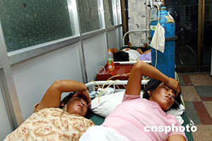 七月十九日,幾名傷者在開封市第一人民醫(yī)院輸氧。位于河南開封的中國(guó)石油集團(tuán)下屬某公司一化工廠冷凝器發(fā)生爆炸,大量氯化氫氣體泄漏。該廠南側(cè)的崗橋村三百七十六名村民出現(xiàn)呼吸道和眼部刺激反應(yīng),較重的出現(xiàn)嘔吐和頭痛癥狀不良反應(yīng),開封市第一人民醫(yī)院和開封縣各醫(yī)院已轉(zhuǎn)移了上百名村民。截至十九日,大部分村民已返家。此次泄漏事故未造成人員死亡。事故中四名責(zé)任人已被警方控制。中新社記者:慎重