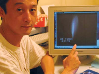 中新網(wǎng)8月1日電 7月24日凌晨,家住青島安達(dá)路24號(hào)的康曉輝在天空發(fā)現(xiàn)一個(gè)“不明飛行物”,并用家用攝像機(jī)拍下了20多分鐘的錄像?罩芯烤故呛挝铮繋滋靵(lái),他一直想破解這個(gè)謎。31日上午,天文專家認(rèn)定,他拍到的是“UFO”,即“不明飛行物”。