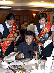 八月一日晚,秦皇島市人民政府,中信實(shí)業(yè)銀行,中國(guó)移動(dòng)通信集團(tuán)在海濱城市秦皇島為即將奔赴雅典的國(guó)家乒乓球隊(duì)領(lǐng)導(dǎo)和運(yùn)動(dòng)員舉行壯行酒會(huì)。中新社記者:張勤