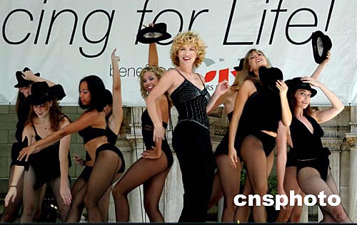 美東時間八月五日中午,紐約市中心布萊恩特公園內(nèi)舉辦《為生命起舞》的義演活動,數(shù)十位百老匯藝員載歌載舞,為艾滋病患者募捐,支持他們在社會生活中繼續(xù)獲得平等權(quán)利。圖為費(fèi)麗莎·芬利(Felicia Finley)(中)引領(lǐng)舞者,表演《用強(qiáng)勁的音符打動我》。作者:陳建