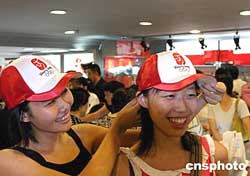 八月六日,北京兩名大學(xué)生專(zhuān)程來(lái)到北京王府井工藝美術(shù)商店的奧運(yùn)特許商品零售專(zhuān)柜前購(gòu)買(mǎi)自己喜愛(ài)的奧運(yùn)棒球帽,剛剛開(kāi)業(yè)第二天的王府井工藝美術(shù)商店奧運(yùn)特許商品零售專(zhuān)柜前擠滿(mǎn)了前來(lái)購(gòu)買(mǎi)奧運(yùn)紀(jì)念品的市民。中新社記者:張勤