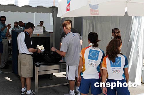 (當(dāng)?shù)貢r(shí)間)二○○四年八月八日,眾多中外記者進(jìn)入希臘雅典奧運(yùn)會(huì)新聞中心開始工作。圖為記者們進(jìn)入新聞中心時(shí)接受嚴(yán)格地安全檢查。中新社記者:毛建軍