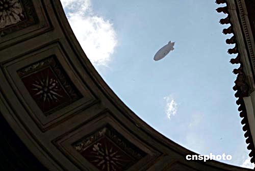 8月12日,一架監(jiān)視飛艇從雅典市區(qū)上空飛過(guò),監(jiān)視各種情況的發(fā)生,以確保奧運(yùn)會(huì)的安全。中新社記者:王瑤