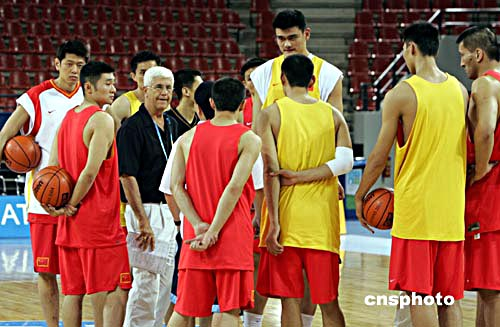 當滿頭銀發(fā)的中國男籃主帥哈里斯姍姍出現(xiàn)在訓練館內時,隊員們開始集合,此時比預定的訓練時間晚了半個多小時。在例行的熱身活動后,中國男籃分成黃、紅兩隊進行了幾套戰(zhàn)術的演練。由姚明、易建聯(lián)、李楠、劉煒、朱芳雨等組成的黃隊無疑是中國男籃的主力陣容。