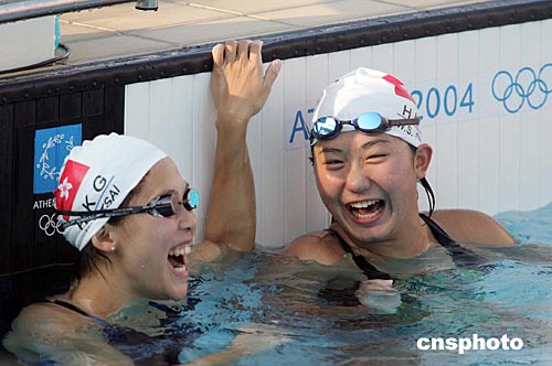 香港奧運游泳選手當?shù)貢r間八月十二日在雅典奧運游泳比賽場進行賽前訓練,心情愉快。中新社記者:毛建軍