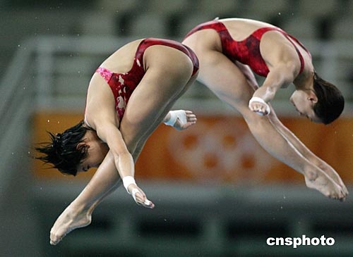 中國(guó)女子十米跳臺(tái)雙人選手李婷、勞麗詩當(dāng)?shù)貢r(shí)間八月十二日下午在雅典奧運(yùn)跳水賽場(chǎng)進(jìn)行賽前訓(xùn)練。中新社記者:毛建軍